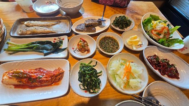 주문을 하고 바로 기본 상차림이 깔렸다. 어느 식당엘 가더라도 기본 상차림 나오는 걸 보면 맛집인지 아닌지 알 수 있다. 3명 모두 공통적으로 기본 반찬만 보고 “맛집”일 거라고 판단했다. 명이나물, 부지깽이나물, 조개젓갈, 조기구이, 떡갈비, 샐러드, 양념게장 모두 맛이 좋다. 국물로는 미역국이 나오는데 참기름으로 볶았으면 어땠을까 하는 2%의 아쉬움이 있다. 메뉴판엔 명이나물과 부지깽이나물은 울릉도 특산물을 사용하고 있고 홍합과 따개비는 100% 자연산이라고 적혀 있다. 식당 뒷편에 넓직한 밭이 보이는데 다양한 쌈채소가 심어져 있다. 채소를 여기서 자체 조달하는 모양이다.