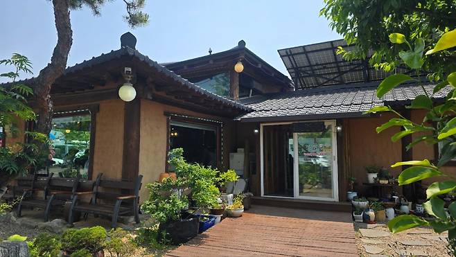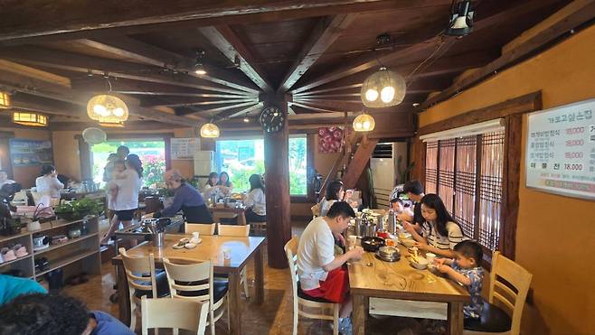 식당이 약간은 외진 2차선 도로에 있는 탓에 눈에도 잘 띄고 앞에 공간도 넉넉해 10여대 정도의 자동차가 너끈히 주차할 수 있다. 식당 앞은 전원주택처럼 조경이 잘 되어 있다. 문을 열고 들어서면 그리 크지 않은 홀에 4인석 테이블이 10여개 정도 놓여 있다. 오후 1시경 방문했는데 겨우 한 테이블 비어 있는 자리에 앉을 수 있었다.