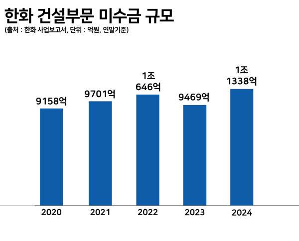 문제는 이러한 ‘사고 사업장’으로 인해 한화의 공사미수금 규모가 나날이 증가하고 있다는 것이다. 한화 사업보고서에 따르면 한화 건설부문 공사미수금(별도) 규모는 2024년 말 기준 1조1338억원으로, 전년 동기 9469억원 대비 19.7% 증가했다.