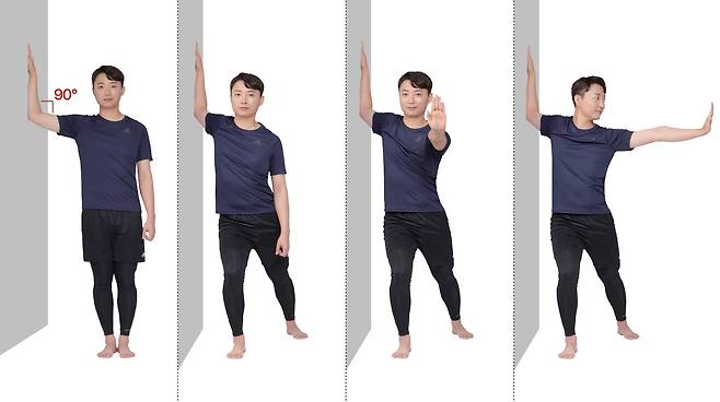 팔꿈치가 90도가 되도록 팔을 들고 손바닥이 팔꿈치보다 조금 뒤에 오도록 벽을 짚습니다.