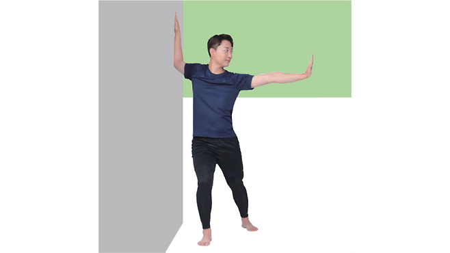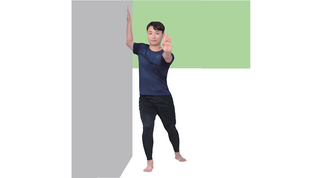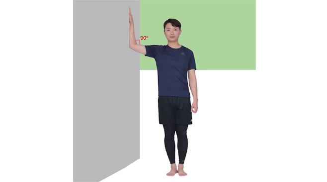 팔꿈치가 90도가 되도록 팔을 들고 손바닥이 팔꿈치보다 조금 뒤에 오도록 벽을 짚습니다.