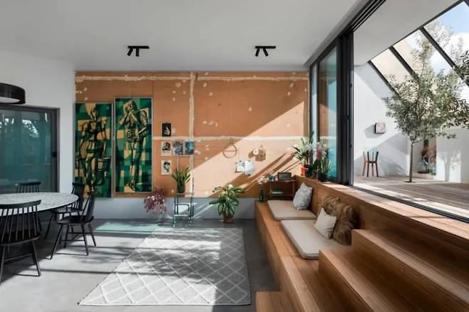 이곳은 바닥부터 천장까지 빛으로 가득 차 있으며, 중앙에 위치한 목재 데크가 주목받는 요소입니다. 그 위로 쏟아지는 자연광은 시간이 흐름에 따라 이동하며, 가구와 장식 위에 리듬 있는 그림자를 드리웁니다. 우드 계단을 따라 올라가면 열린 느낌의 다이닝 공간이 펼쳐집니다.