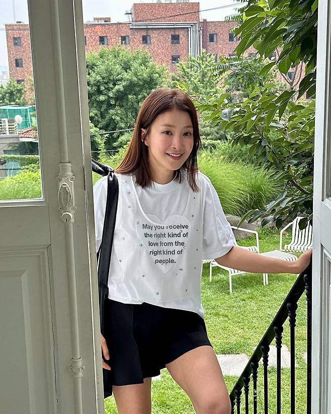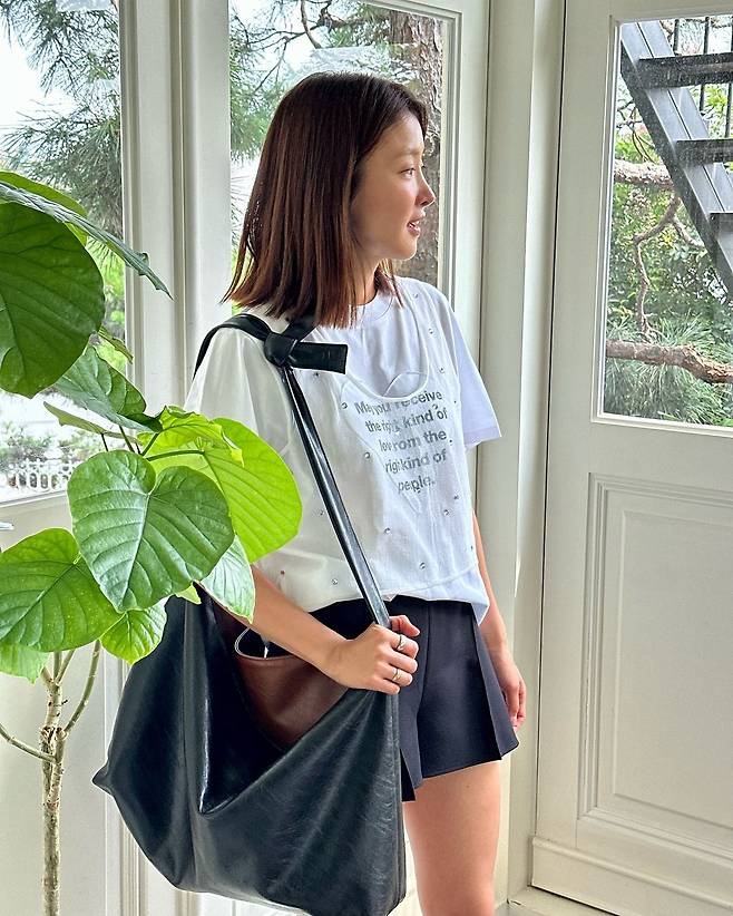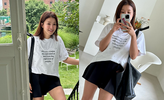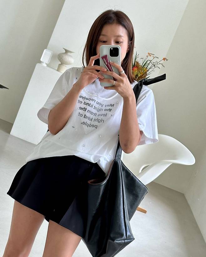 사진 속 이시영은 레터링이 있는 흰색 티와 펄이 있는 시스루 베스트를 레이어드 하였고 블랙 숏팬츠와 숄더백을 들어 꾸안꾸룩을 선보였다.