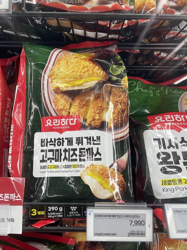 요리하다 바삭하게 튀겨낸 고구마 치즈돈까스 은 390g 냉동 포장 제품으로, 고구마와 치즈,돼지고기 돈까스를 바삭하게 튀겼어요.