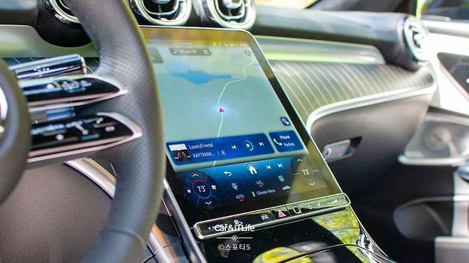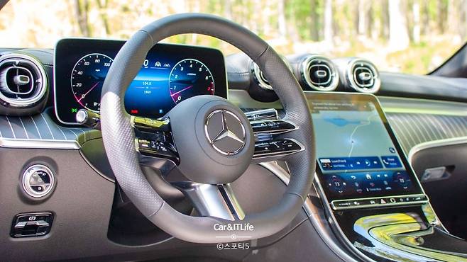 하지만 실내는 아쉬운 점이 많습니다. 중앙의 큰 화면이 실내를 압도하며, 기능은 좋지만 다소 촌스럽게 느껴집니다. 스티어링 휠의 햅틱 버튼은 싸구려 느낌이 들고 사용하기 어렵고, 미러 조절용 패드도 하나뿐입니다. 큰 화면을 선호한다면 인테리어의 전체적인 모습이 마음에 들 수도 있지만, 많은 소재가 저렴하게 느껴집니다. 요추 조절과 같은 기능이 인포테인먼트 시스템 깊숙이 숨겨져 있다는 점도 아쉽습니다. 클래식 메르세데스 오너라면 CLE의 실내에 익숙해지기 어려울 수 있습니다.