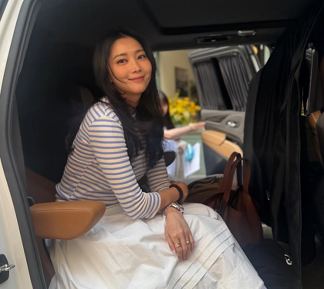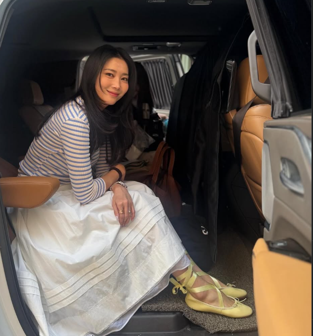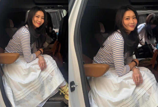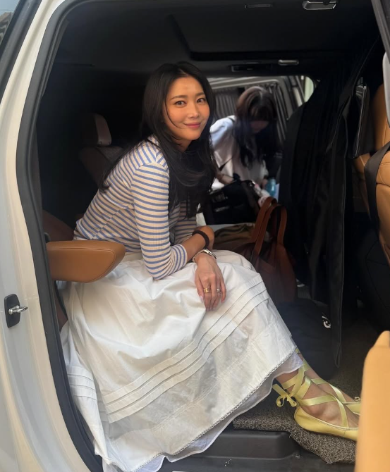 오윤아 님의 이번 스타일은 청량하고 소녀스러운 매력이 돋보이는 패션이었어요. 하늘색과 흰색이 조화를 이루는 스트라이프 티셔츠와 넓게 퍼지는 화이트 롱스커트로 청순하면서도 여성스러운 분위기를 강조한 룩이었습니다.