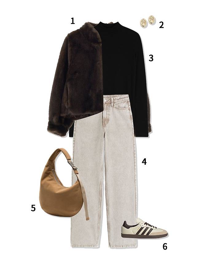 1 에코퍼 : 망고매니플리즈(298,000원) 2 귀걸이 : 오브라비쉬에(33,000원) 3 1+1니트 : 로시로우(72,000원) 4 데님 : H&M(39,900원) 5 가방 : 엣클립(210,000원) 6 스니커즈 : 아디다스(139,000원)