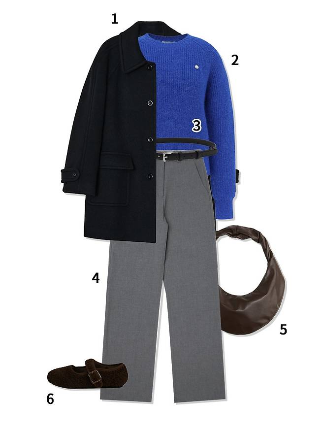 1 코트 : 오스트카카(359,000원) 2 니트 : 룩캐스트(108,000원) 3 벨트 : 타티아나(49,000원) 4 슬랙스 : 시야쥬(89,000원) 5 가방 : H&M(39,900원) 6 메리제인슈즈 : 츄바스코(89,000원)