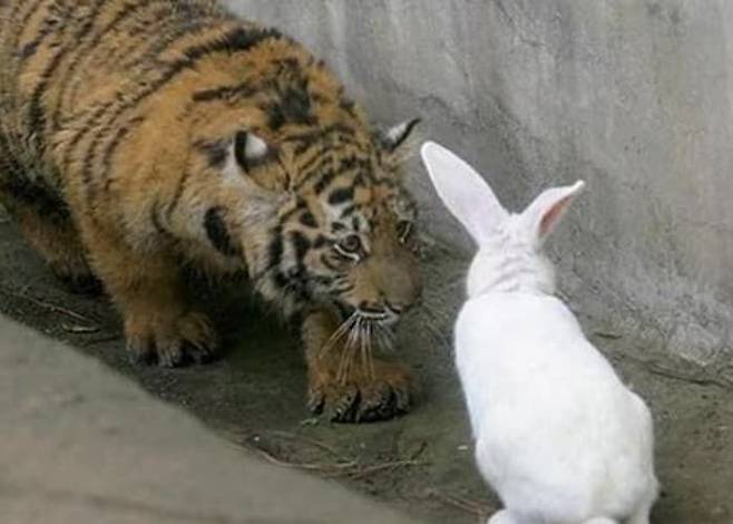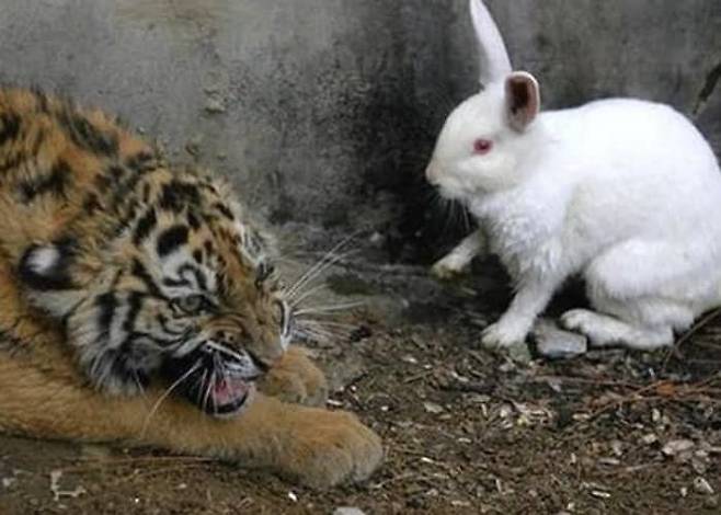 하루는 배고픈 아기 호랑이를 위해 사육사는 토끼를 우리 안으로 집어 넣어줬죠. 토끼를 먹잇감으로 집어 넣은 것. 사실 이때까지만 하더라도 아기 호랑이가 토끼를 잡아 먹을 줄 알았습니다.