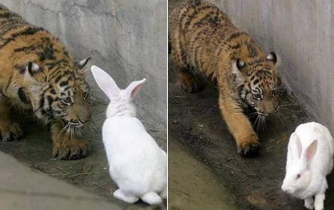 먹잇감으로 호랑이 우리 안에 들어갔던 토끼는 순식간에 아기 호랑이랑 어울리며 놀고 있었는데요. 이게 정말 가능한 일인지 두 눈을 의심하게 만듭니다.