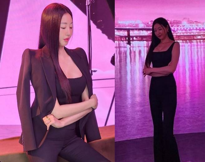 김사랑은 블랙 슬리브리스 크롭톱과 함께 블랙 블레이저를 매치해 강렬하고 세련된 매력의 올블랙 패션을 선보였습니다.