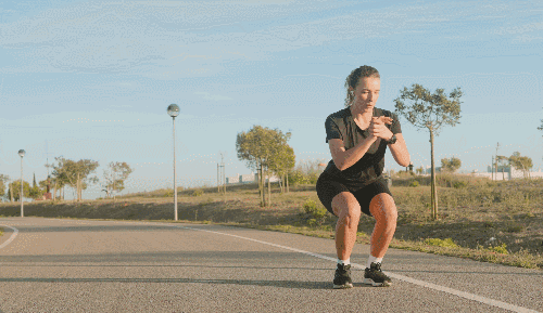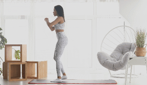 바닥에 서서 다리를 어깨너비로 벌리고, 무릎을 구부리며 엉덩이를 뒤로 빼 스쿼트 자세를 만듭니다. 손은 가슴 앞에서 모아 균형을 잡고, 스쿼트 자세를 유지한 채 오른쪽으로 한 걸음 이동한 후, 왼쪽으로도 동일하게 반복하며 좌우로 움직입니다.