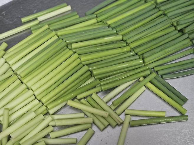 마늘쫑은 먹기 좋은 크기로 잘라주세요. 너무 짧으면 식감이 덜하고, 너무 길면 먹기 불편하니 대략 4~5cm 정도로 잘라주세요.
