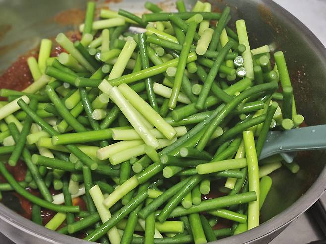 양념이 자작해지고 끓기 시작하면 불을 줄여 주고 물기를 뺀 마늘쫑을 넣고 양념이 잘 묻도록 중불에서 충분히 볶아주세요.