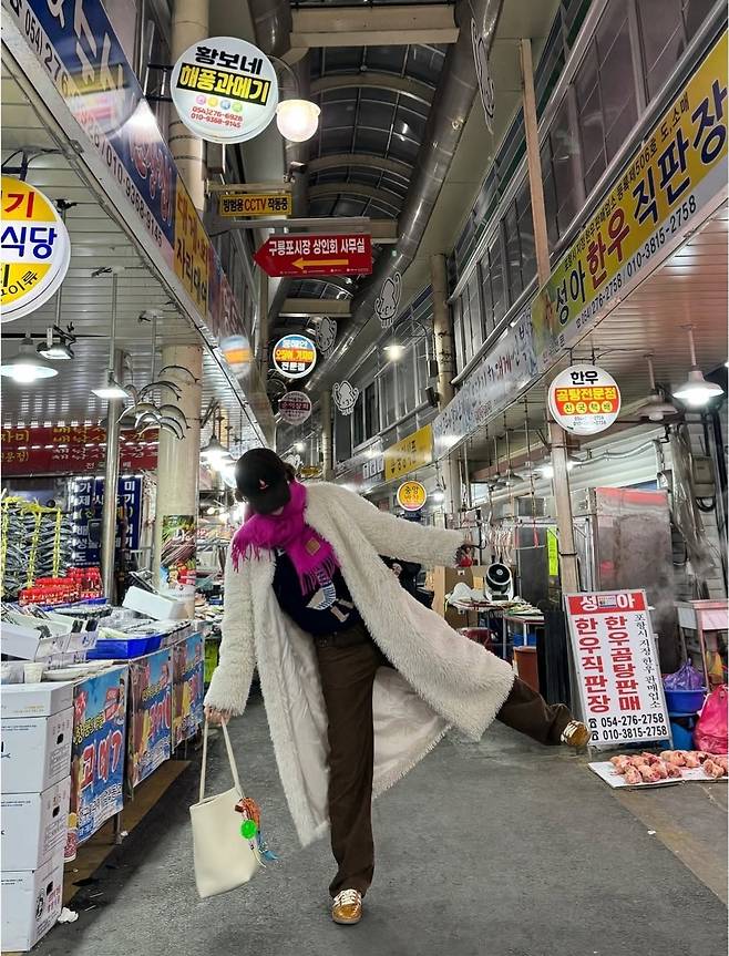 최은경은 포근한 화이트 퍼 롱코트에 컬러풀한 아이템을 매치해 단조로움을 탈피한 세련된 스타일을 완성했습니다.