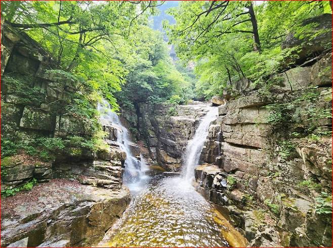 용추폭포와 쌍폭포 : 3단으로 떨어지는 폭포와 두 줄기 물줄기가 마주 보는 절경.