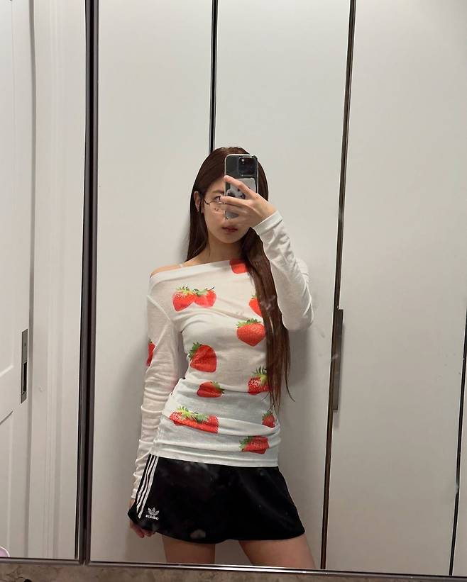 딸기 프린트가 가득한 상의는 그녀의 밝고 발랄한 이미지를 더욱 부각시킨다. 얇은 소재의 티셔츠는 가볍고 캐주얼한 느낌을 더하며, 여기에 어깨를 살짝 드러내는 디테일이 스타일의 포인트를 살려준다. 블랙 미니스커트는 심플하면서도 스포티한 매력을 더해 일상에서도 따라 하기 좋은 스타일링으로 완성된다.