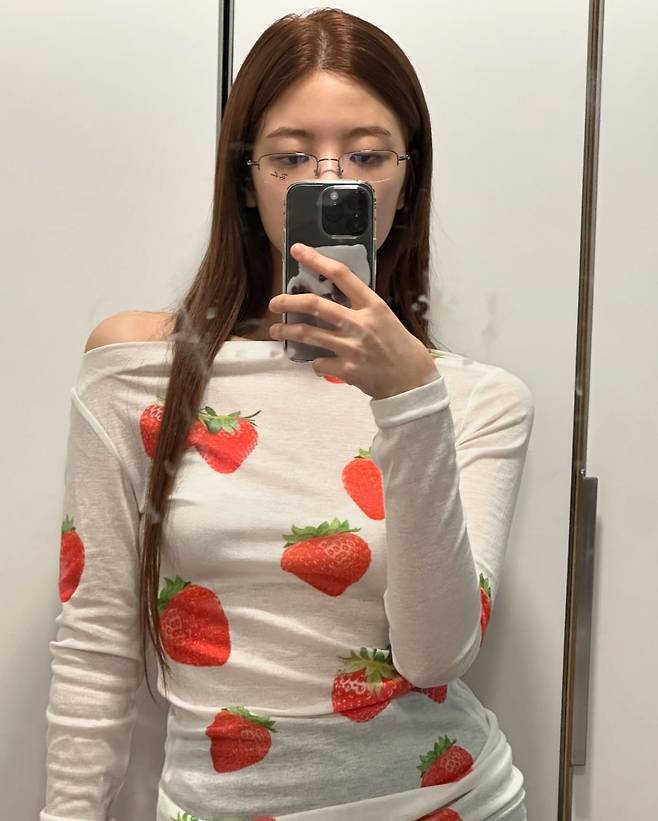 리아는 최근 자신의 인스타그램에 거울 셀카 사진을 올리며 색다른 패션을 선보였다. 사진 속 그녀는 딸기 프린트가 돋보이는 화이트 티셔츠와 블랙 스커트를 매치해 귀여우면서도 세련된 분위기를 연출했다.