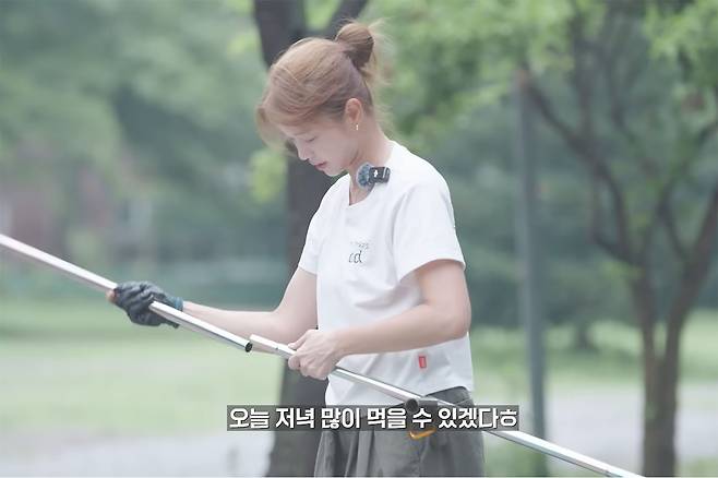 그녀는 홀로 12인용 텐트를 치는 모습을 선보였다. 43분 만에 텐트를 완성한 그녀는 가뿐 숨을 내쉬며 여유를 즐겼다. 이후 그녀는 직접 준비해 온 닭다리를 손질 후 자메이카 통다리를 만들었다.