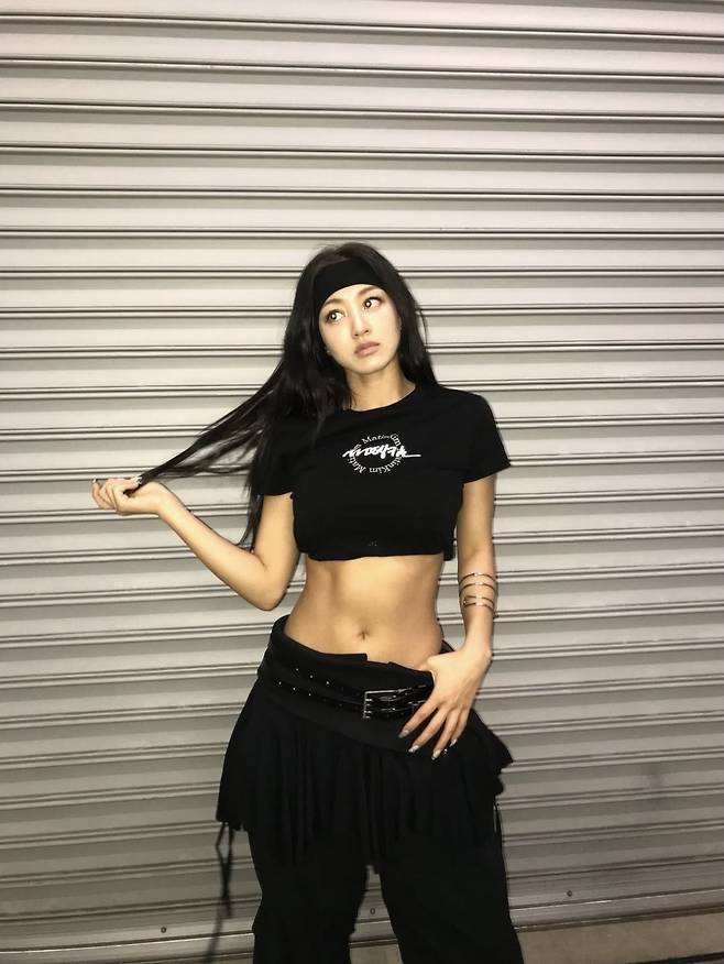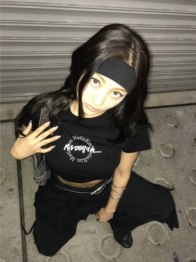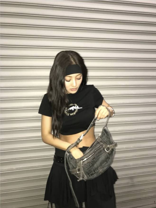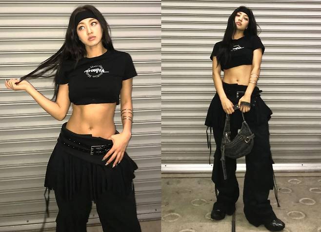 복근이 드러나는 과감한 실루엣은 지효 특유의 탄탄한 바디라인을 극대화했고, 굵은 팔찌와 헤어밴드, 빈티지 백으로 마무리된 디테일은 레트로와 스트릿의 경계를 자유롭게 넘나들었습니다.
