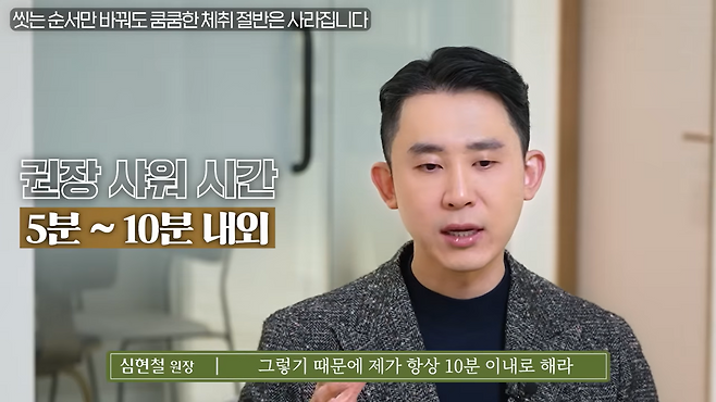 피부 장벽을 지키기 위해 샤워 시간은 10분 이내로 제한하는 것이 바람직하다고 조언한다. 특히 해면이나 때수건 사용은 가급적 피해야 한다고 강조했다.