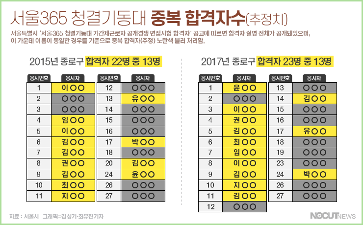 2015년과 2017년 서울시의 청결기동대 합격자 공고(실명 전체 공개)에서 이름이 같은 경우를 기준으로 중복 합격자를 추정해보니, 종로구에만 20여 명 가운데 13명이었습니다. 다른 자치구의 합격자 명단을 비교해봐도 해마다 이전년도와 동일인으로 추정되는 이들이 다수 발견됐죠.