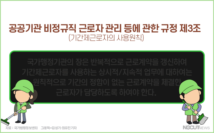 국무총리훈령인 공공기관 비정규직 근로자 관리 등에 관한 규정 제3조에 따르면, 무기계약직이 상시지속업무를 담당하는 게 원칙입니다. 다만, 기간제 근로자를 사용할 수 있는 예외 경우도 명시하고 있는데요. 그러나 같은 규정 제4조에는 당해 사업에서 동종 업무에 종사하는 기간제근로자를 무기계약직과 차별적 처우해선 안 된다는 내용도 있습니다.