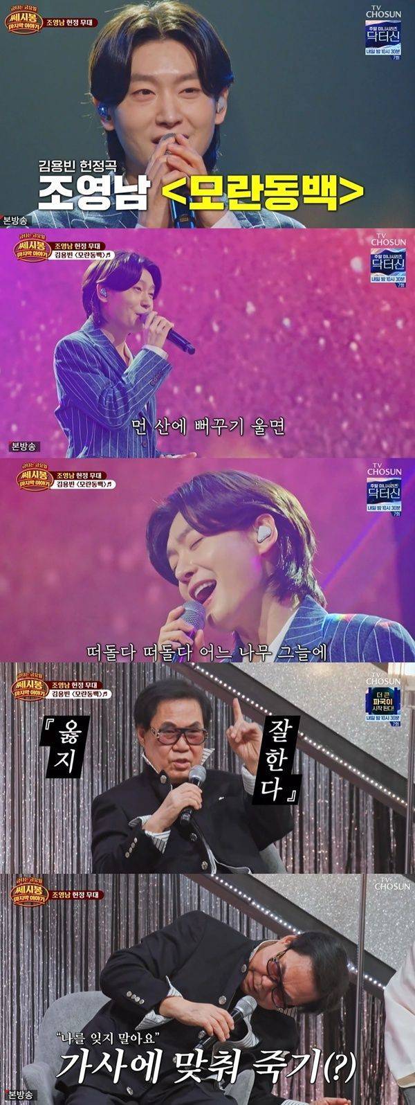 이상벽은 "이 노래는 장례식용으로 만든 노래다. (조영남이) 누워서 부르는 세계 유일의 가수"라고 해 웃음을 안겼다.
