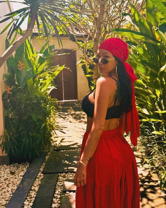 특히 등과 힙 라인을 과감하게 드러낸 비키니 백뷰 사진은 건강하고 탄탄한 그녀의 몸매를 가감 없이 보여주며 감탄을 자아냈습니다. 여기에 건강하게 태닝된 피부 위로 선명하게 보이는 커다란 타투는 하나의 액세서리처럼 작용하며 룩의 포인트 역할을 톡톡히 해냈습니다.