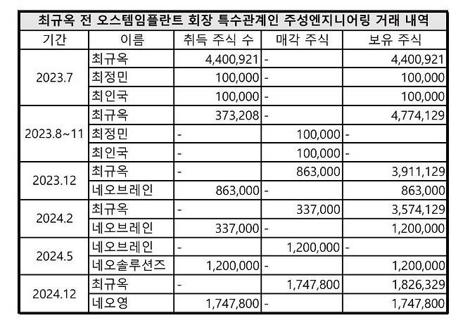 지난해 5월 주성엔지니어링이 분할을 발표하기 전후에도 최 회장의 가족법인 대상 지분 매각은 지속됐다. 지난해 2월 최 회장은 33만7000주를 주당 4만원에 네오브레인에 매각했다. 같은해 5월 네오브레인은 보유하고 있던 지분 전량을 네오솔루션즈에 매각했다.