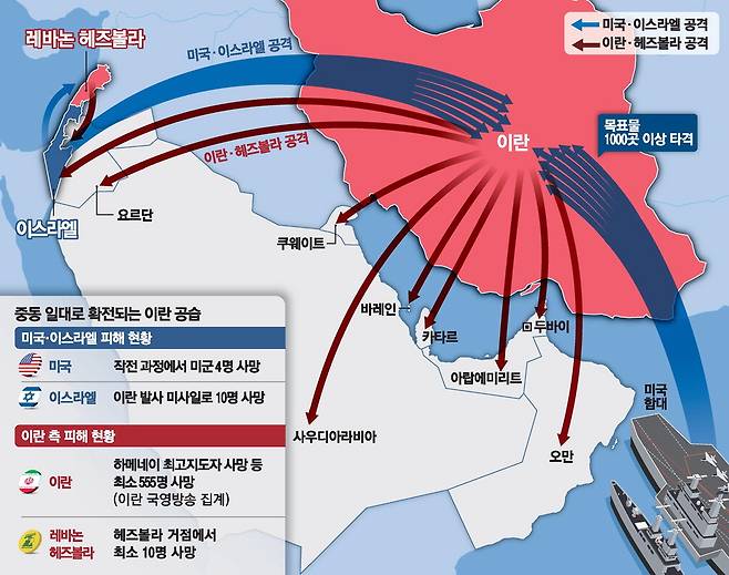 이란은 이스라엘과 미군 기지뿐 아니라 페르시아만 국가 민간시설에 '가랑비' 타격을 가했고, 레바논 무장단체 헤즈볼라가 이스라엘을 상대로 보복 공습에 가세했다.