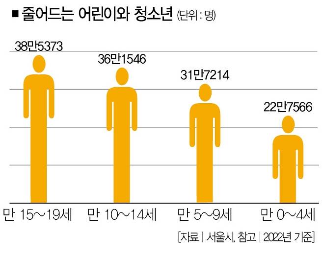 그렇다고 '강 건너 불구경' 하듯 손을 놓고 있을 만한 상황은 아니다. 서울 전역에서 청소년의 수는 점차 줄고 있다. 만 15~19세 서울 청소년은 2020년 40만8101명에서 2022년 38만5373명으로 5.6% 감소했다. 더 어린 나이대인 만 10~14세 어린이와 청소년은 2022년 36만1546명, 만 5~9세 어린이는 31만7214명, 만 0~4세 유아는 22만7566명으로 그 수가 더 적다.
