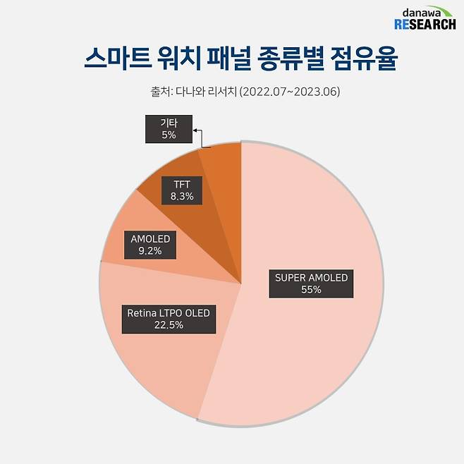 스마트 워치 패널은 브랜드 점유율에 영향을 받는다. 현재 가장 많은 스마트 워치에 탑재되어 있는 패널인 슈퍼 아몰레드는 삼성전자가 자사 스마트 워치에 사용하는 패널이다. 점유율은 55%로 삼성전자의 스마트 워치 시장 점유율과 유사하다. 2위는 당연히 애플이 사용하는 패널, 레티나 LTOP OLED다. 이 역시 애플의 점유율과 유사한 22%의 점유율을 보인다.
