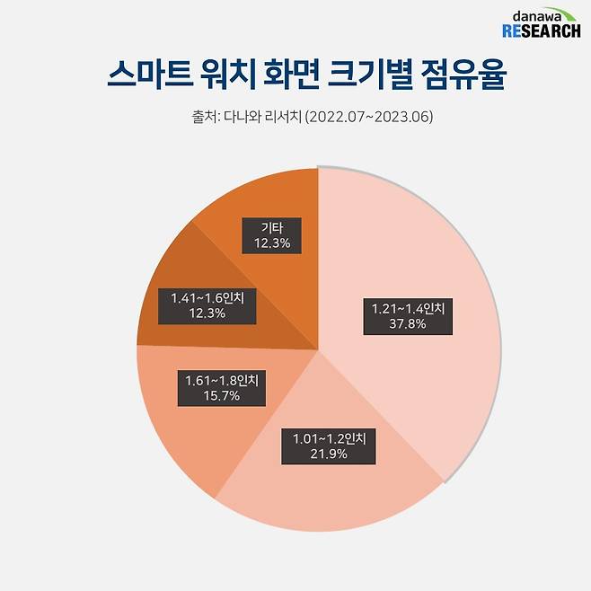 디스플레이를 가진 스마트기기는 대부분 '거거익선'이다. 화면이 넓으면 넓을수록 좋다는 말인데 손목에 착용해야 하는 스마트 워치는 얘기가 다르다. 가장 판매가 많이 일어난 디스플레이는 1.5인치 미만으로 점유율 순위를 따져보면 1.21~1.40인치가 37.8%로 1위를 기록했고 1.01~1.20인치가 21.9%로 뒤를 이었다. 반면, 비교적 대형 디스플레이에 속하는 1.81~2인치는 9%에 그쳤다.