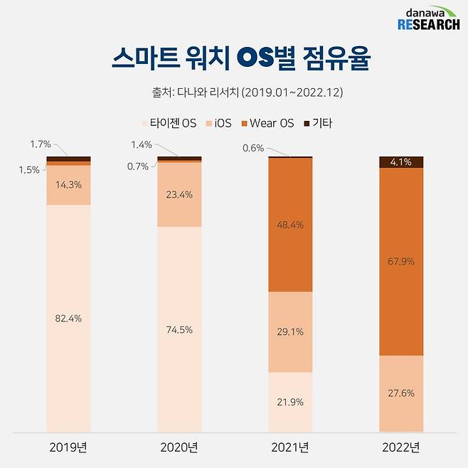 2020년까지 스마트 워치 운영체제를 주름잡던 ‘타이젠’이 역사 속으로 사라졌다. 2019년 80%가 넘었던 타이젠의 점유율은 2022년 0.4%로 곤두박질쳤다. 타이젠의 자리를 꿰찬 건 구글에서 제작한 안드로이드 기반 스마트 워치 운영체제 Wear OS다. Wear OS는 2020년 0%대에서 점유율이 급등해 2021년 48%, 2022년 67%에 달하는 점유율을 차지하며 그야말로 신데렐라가 됐다.