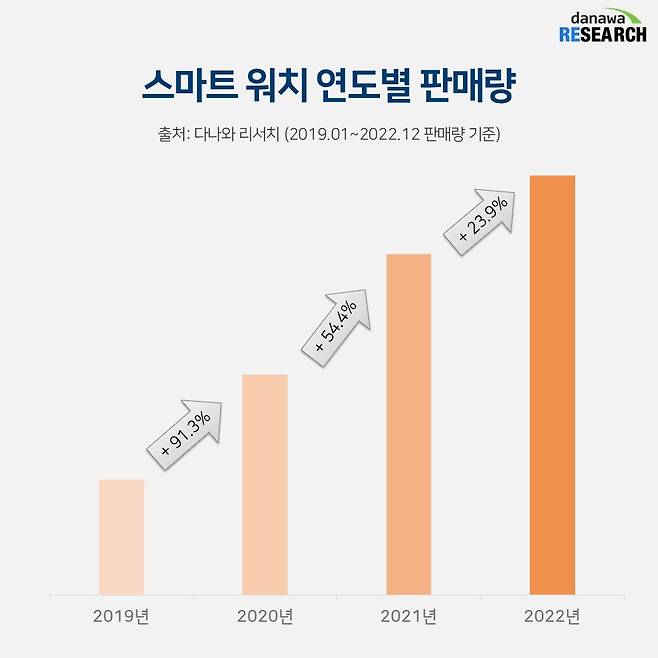 스마트 워치가 상승세를 제대로 탔다. 2020년 판매량이 전년 대비 무려 90% 이상 상승한데 이어 2021년과 2022년에도 54%, 23% 성장을 기록하며 뚜렷한 상승 곡선을 그렸다. 상승폭은 작아지고 있지만 괄목할 만한 성과다.