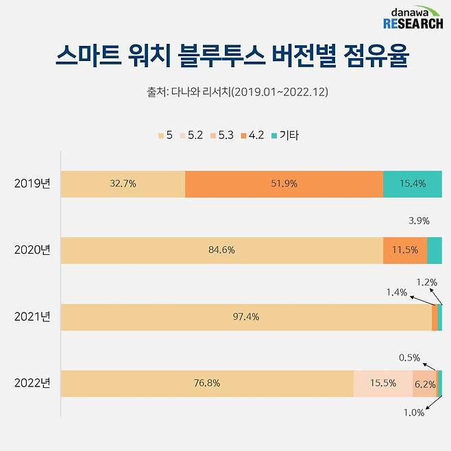 실제 다나와 리서치에 의하면 블루투스 5.3이 등장했음에도 블루투스 5 버전이 2022년 가장 높은 점유율을 가져갔다. 점유율은 70%, 2021년 97%에 달했던 점유율을 생각하면 뼈 아픈 하락이지만 여전히 압도적인 점유율이다. 블루투스 5.2가 15%로 점유율 2위를, 가장 성능이 좋은 블루투스 5.3은 6%를 겨우 기록하며 체면치레를 했