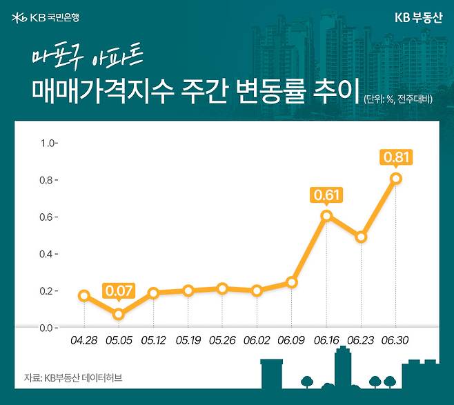 이 같은 흐름은 마포구 아파트 전반의 가격 상승세로도 이어지고 있습니다. KB부동산이 발표한 7월 1주차(6월 30일 기준) 주간 아파트 매매가격지수에 따르면, 마포구는 한 주 만에 0.81% 상승하며 전국 아파트 중 양천구(1.00.%), 과천(0.92%)에 이어 세 번째로 높은 상승률을 기록했습니다. 이는 올 들어 가장 큰 폭의 상승률 보인 것입니다.