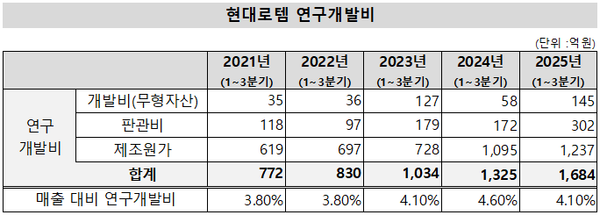 18일 전자공시시스템에 따르면 현대로템의 올해 1~3분기 누적 연구개발비는 1684억원이다. 지난해 같은 기간(1325억원)과 비교하면 27.1% 늘었다. 매출 대비 연구개발비 비율은 4.1%로 지난해 동기(4.6%)보다 소폭 줄었다. 다만 같은 기간 매출이 43.5% 증가한 것을 감안하면 의미 있는 수준의 변화는 아니다.