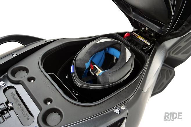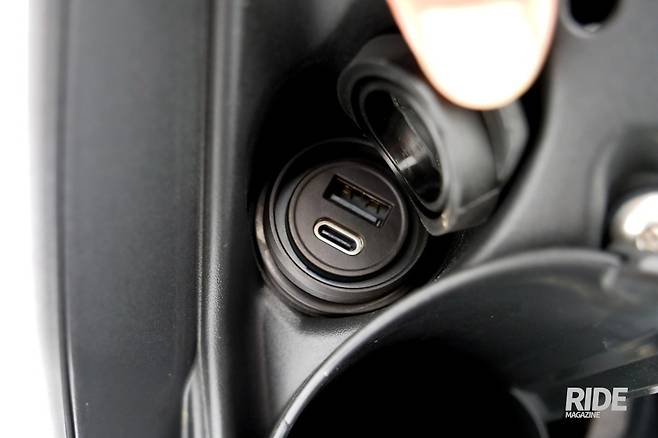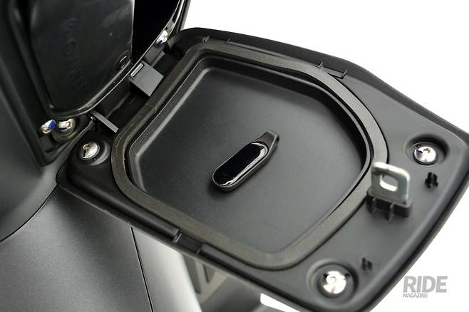 수납공간은 시트 아래 풀페이스 헬멧 하나와 약간의 소지품을 넣을 수 있는 공간이 있고, 소지품은 이너 패널 좌우 글러브 박스에 보관할 수 있다. 스마트폰 사용자를 고려해 좌측 글러브 박스 내부에 USB 포트가 더해져있는데, A타입과 C타입 2종류를 모두 지원하기 때문에 고속 충전이나 2대 동시 충전이 가능하다.