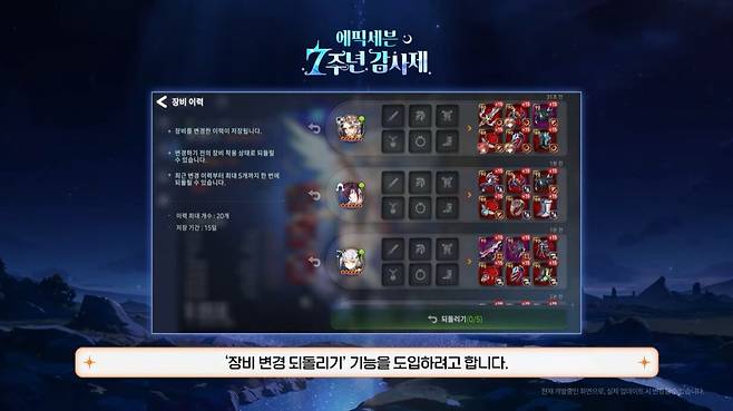 신규 캐릭터 소개에 이어 탁광진 디렉터는 그간 설문조사를 통해 유저들이 가장 많이 피드백했던 장비 관련 부분에 대한 개선안을 제시했다. 서비스가 계속 이어지면서 콘텐츠와 영웅이 누적되어 온 만큼, 유저들이 여러 장비를 돌려쓰거나 세팅을 바꾸는 과정에서 기존의 방식으로는 불편함이 많았다. 이에 28일부터는 장비 변경 되돌리기 기능을 도입, 장비 세팅을 변경한 기록을 남겨서 유저가 선택한 시점으로 한 번에 복원할 수 있게 된다. 또한 세팅 연구를 부담없이 할 수 있도록 장비 해제 비용이 전면 무료화된다.