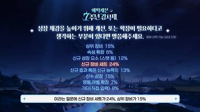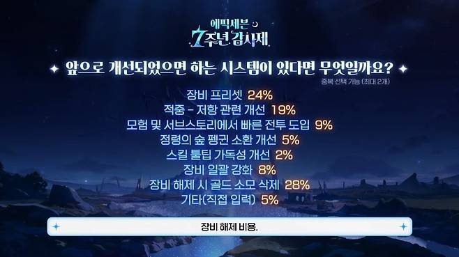 이러한 작은 부분 외에도, '에픽세븐'의 게임 방향성을 전반적으로 바꾸는 작업이 이어진다. 탁광진 디렉터는 "장비 파밍 시스템과 할 것이 많은 것도 에픽세븐의 재미 요소 중 하나라고 생각은 하지만 지금보다 피로도는 훨씬 줄여야 한다고 생각한다"며 플레이 스트레스 및 부담을 대폭 완화할 것을 예고했다.