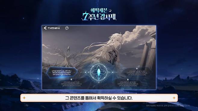 우선 로드맵 소개에 앞서서 28일 업데이트 이후 콘텐츠를 통해 획득할 수 있는 신규 영웅 '기원의 라스'가 소개됐다. '기원의 라스'는 에픽세븐 프리퀄 에피소드 '오리진'에 등장해 유저들의 관심을 받은 영웅으로, 에픽세븐 세계관 전체를 아우르는 주인공이다. 그에 걸맞는 위력을 보유한 광속성 기사 캐릭터로 현재 디자인 중이며, 7주년을 맞아 28일 업데이트 후 기원의 라스 전용 콘텐츠를 통해 게임플레이만으로 획득할 수 있을 예정이다. 또한 단순 획득을 넘어 콘텐츠 플레이로 SSS등급까지 각인할 수 있는 재료도 획득할 수 있다. 아울러 전용 아티팩트 '소중한 인연'도 7주년 출석 이벤트로 얻을 수 있다.