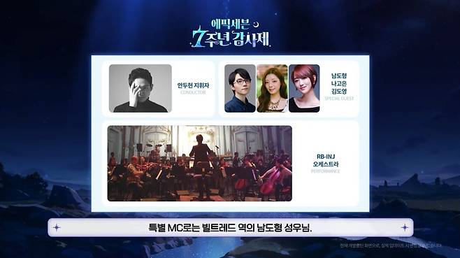 에픽세븐 첫 공식 오케스트라 콘서트, '심포니 No.7: 오르비스'도 예고됐다. 에피소드 1, 2에 나온 곡을 중심으로 총 31곡이 오케스트라로 편곡됐으며, 남도형 성우가 특별 MC로 참여한다. 스페셜 게스트로는 나고은(퍼플키스)가 출연한다. 또한 글로벌 유저를 위해 이번 오케스트라는 실시간 방송으로 생중계되며, 방송 중 특별 쿠폰이 공개된다. 이외에도 오는 8월 21일부터 30일까지 이마트24와 콜라보 발표, 오리진 에피소드 기념 3번째 아트북 출시 등 팬심을 자극할 소식들이 이어졌다. 그리고 2부 마지막에는 7주년 쇼케이스 선물로 5성 보스 월광 선택권과 금빛 전승석 77개, 머라고라 100개, 속도 20 부옵션이 포함된 88레벨 목걸이가 지급되는 쿠폰이 공개됐다.
