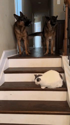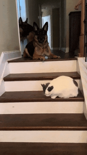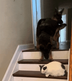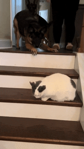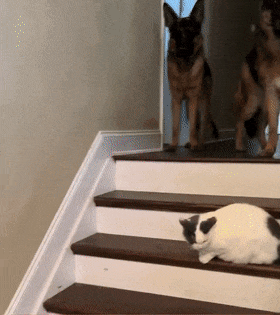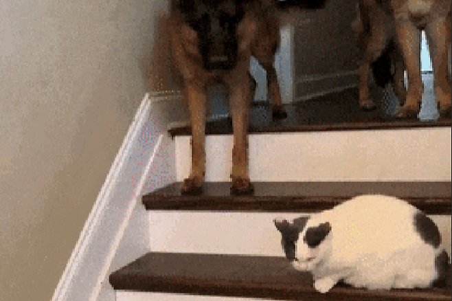 작은 고양이가 그저 계단에 엎드려 쉬고 있을 뿐인데, 옆으로 충분히 지나갈 수 있는데도 두 마리의 큰 저먼 셰퍼드는 한참 동안이나 조심스럽게 탐색만 하고, 섣불리 아래로 내려가지 못했습니다.