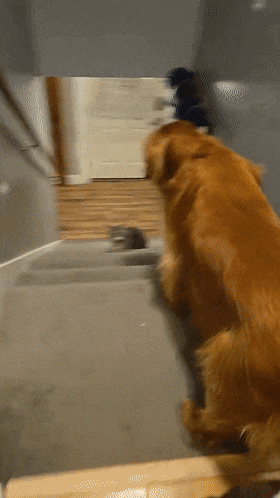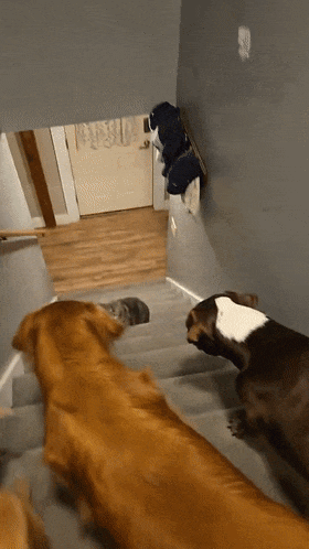 다섯 마리의 대형견들이 계단 입구에 옹기종기 모여 꼼짝 못 하는 상황이 벌어진 것인데요, 그 이유는 다름 아닌 계단에 자리 잡은 작은 고양이 한 마리 때문이었습니다.