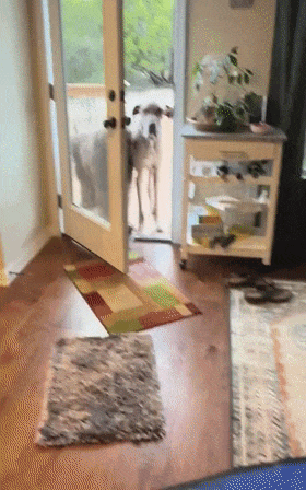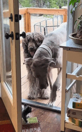작은 강아지가 혼자 제풀에 지쳐서 집 안으로 들어가자 그때서야 큰 강아지들이 집 안으로 들어올 수 있었습니다!