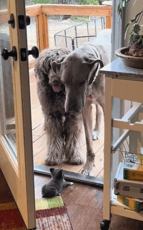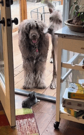 이 큰 강아지들은 한참을 망설이다가 마침내 한 발을 내디뎠지만, 작은 녀석과 눈이 마주치자마자 바로 뒷걸음질 쳤습니다.