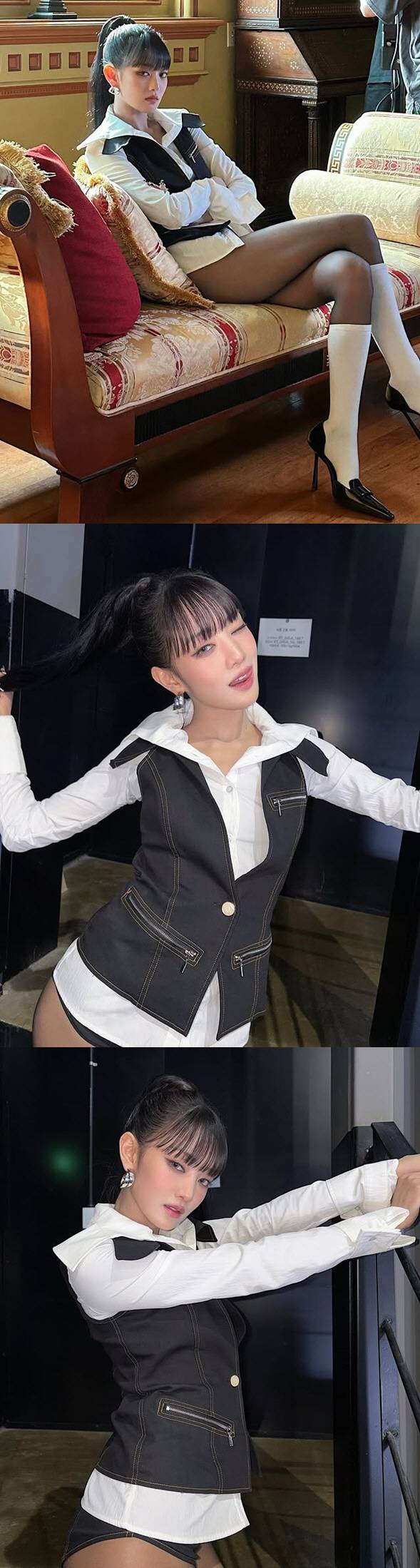 공개된 사진 속 민니는 포니테일 헤어스타일에 강렬한 메이크업으로 섹시 카리스마를 발산하고 있다. 해당 의상은 민니가 신곡 뮤직비디오에서 입었던 것으로 독보적인 포스를 내뿜고 있다.