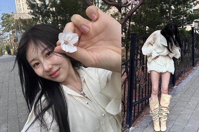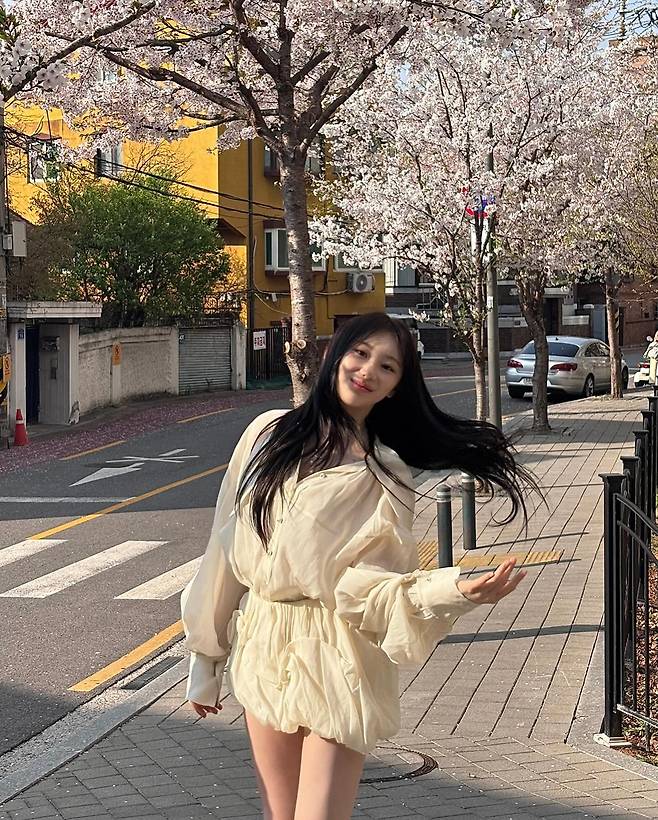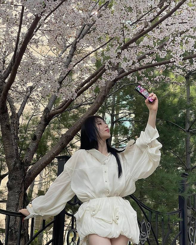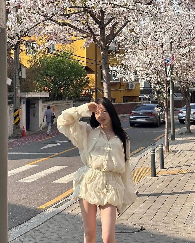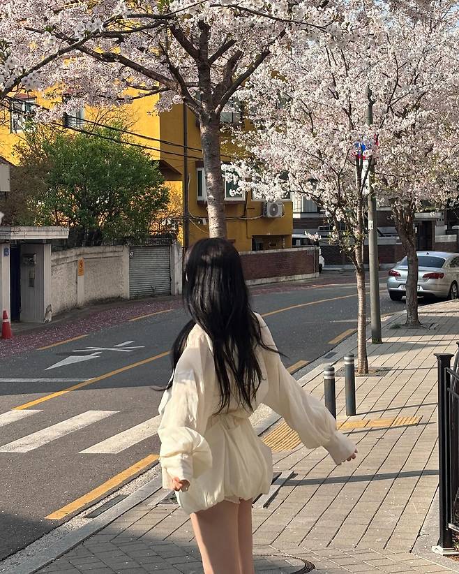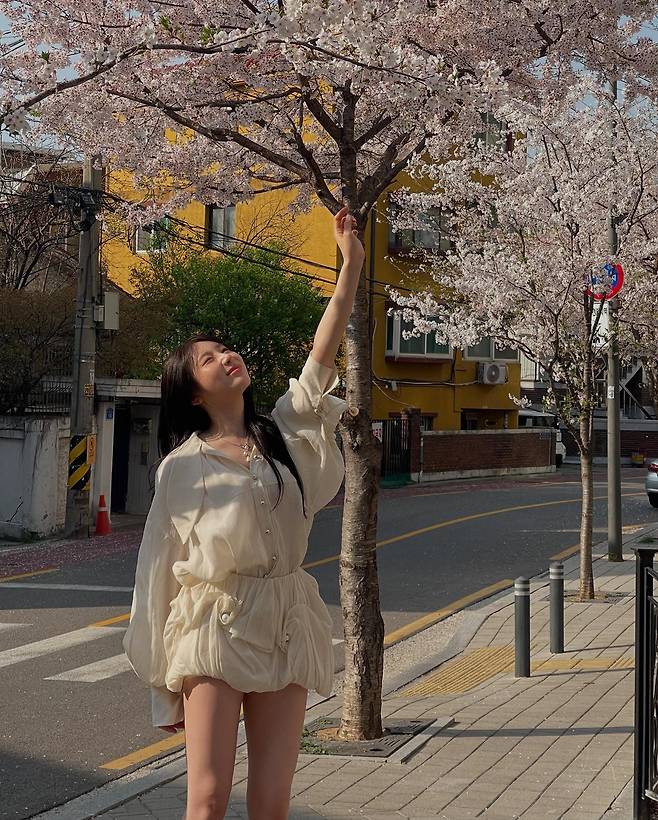 가수 이채연이 벚꽃이 만개한 풍경과 함께 페미닌한 룩을 착용해 설레는 봄 감성을 담았습니다.